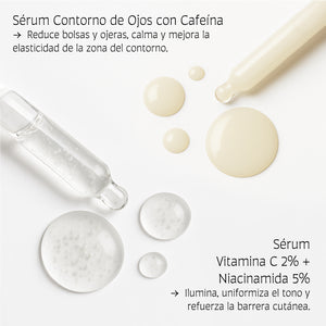 Una rutina diseñada para iluminar, revitalizar y proteger la piel cada mañana. La combinación del Sérum Vitamina C + Niacinamida y el Contorno de Ojos con Cafeína+ ofrece un tratamiento integral contra los signos de fatiga, aportando luminosidad y frescura desde la primera semana de uso.