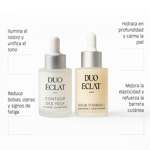 Comienza con una limpieza suave para preparar la piel. Aplica el Sérum Vitamina C Duo Éclat, que ilumina, unifica el tono y protege frente al estrés ambiental. A continuación, aplica el Contorno de Ojos Duo Éclat con suaves toques para hidratar, reducir bolsas y ojeras, y suavizar líneas de expresión. Finaliza siempre con un protector solar para prevenir manchas y envejecimiento prematuro.